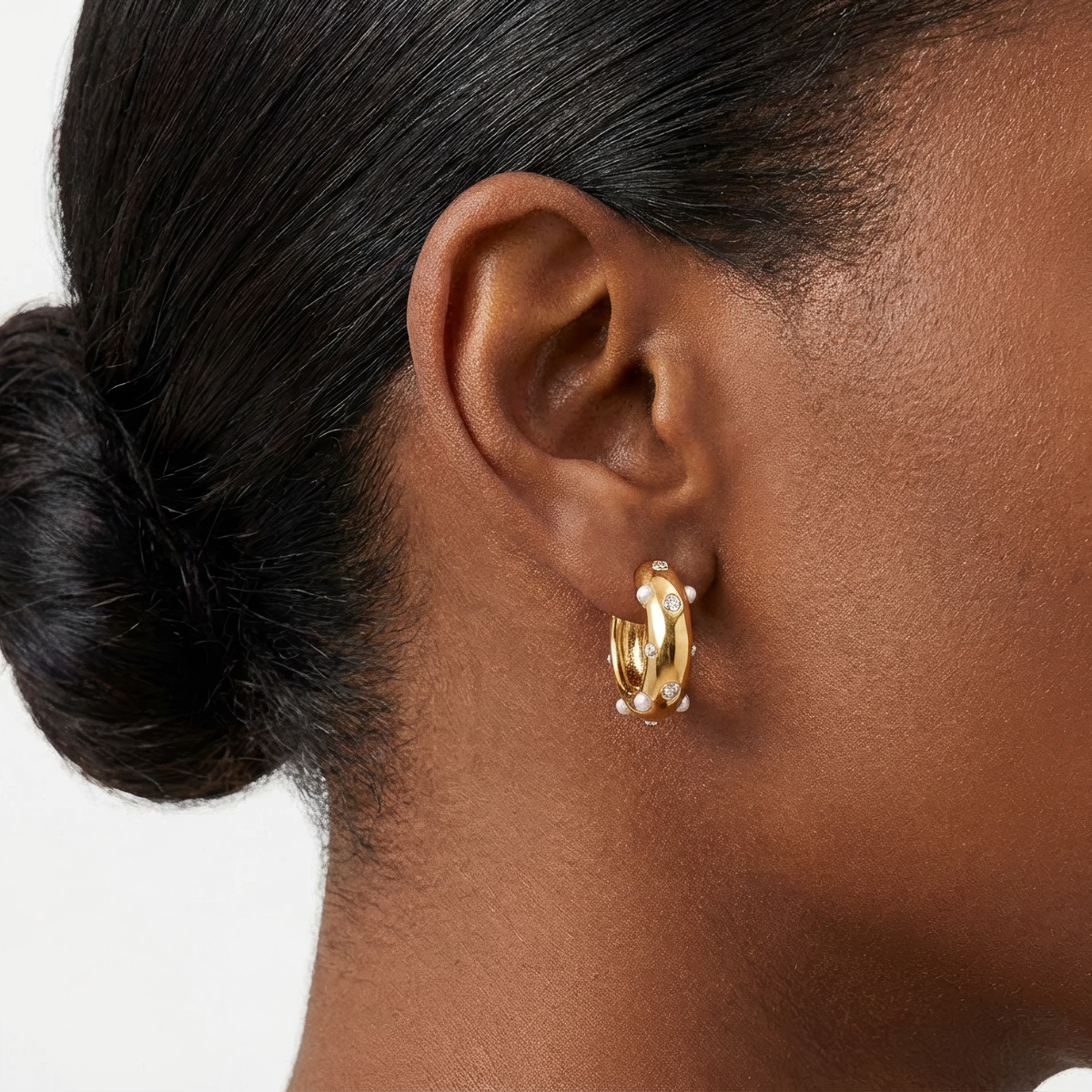 Earrings are a jewellery staple, and these gold-plated hoop earrings are sure to become a go-to for all occasions. Each hoop is embellished with sparkling glossy pearl and zircon stone, encased in 18k PVD gold-plated stainless steel for a shine that's sure to last.