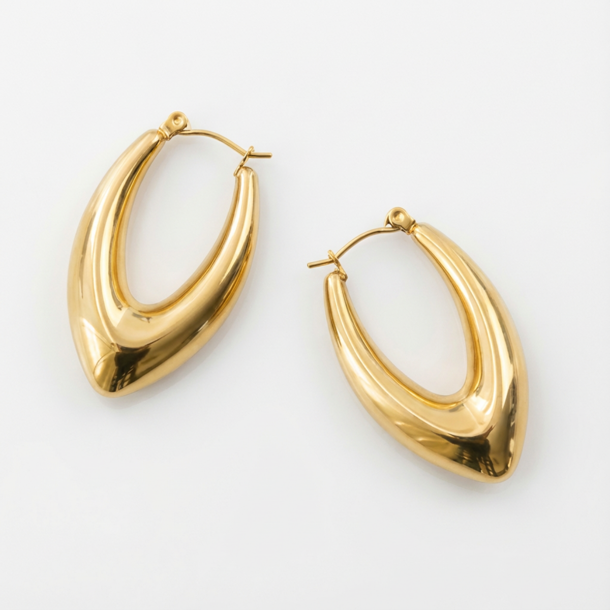 This earring is a modern take on the classic hoop. An 18k gold-plated stainless steel chunky geometric hoop design, it is crafted with thick hollow oval shape hoops that make for a comfortable fit that never gives up its cool style.