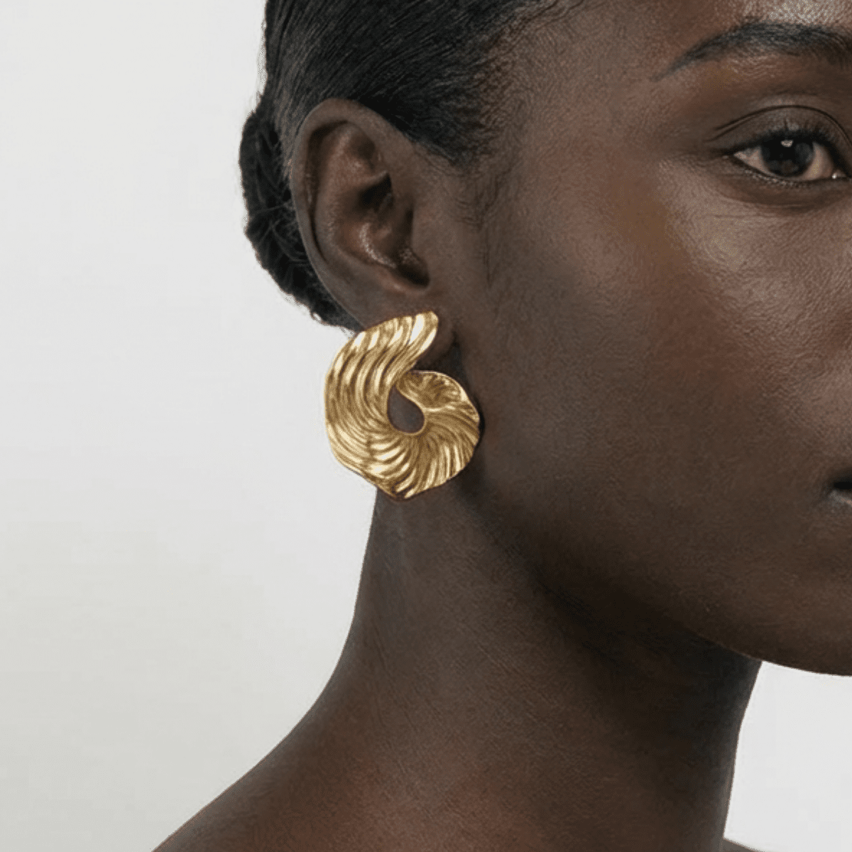 The Sora Swirl Stud Earrings are inspired by the soft curves of ocean waves, bringing fluidity and elegance to a bold statement design. These sculptural studs are perfect for elevating any look, from casual daytime styling to chic evening outfits.